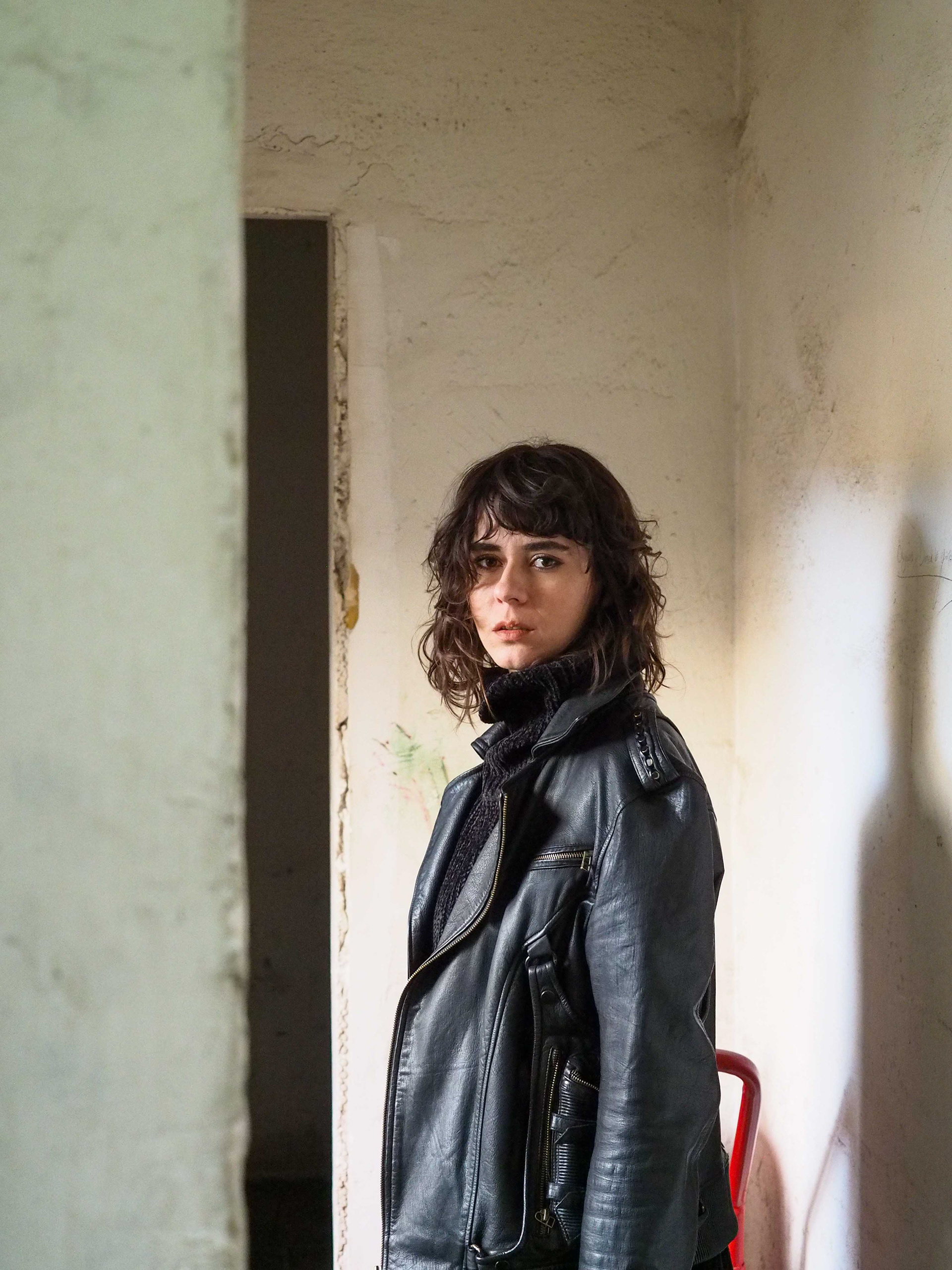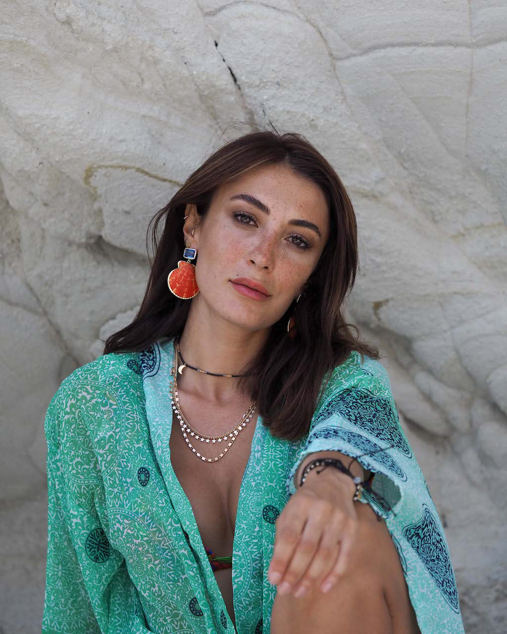 A woman sits on a sandy beach boardwalk with a black shirt draped over her shoulders, gazing intently at the camera against a backdrop of calm seas and overcast skies